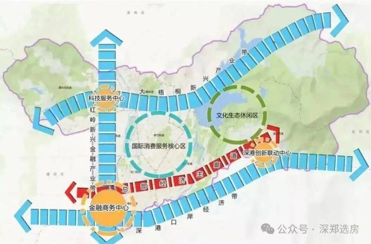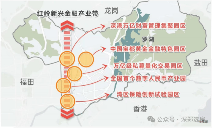 大湾区金融极:其中红岭新兴金融产业带作为"深圳三大金融增长极”之一,与前海国际金融城、福田香蜜湖金融街并列,罗湖将先天的金融优势及政府的政策支持,以金融产业赋能罗湖新发展,助力深圳成为大湾区经济发展引擎。( 信息来源:罗湖发布)