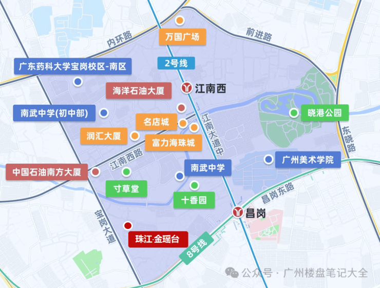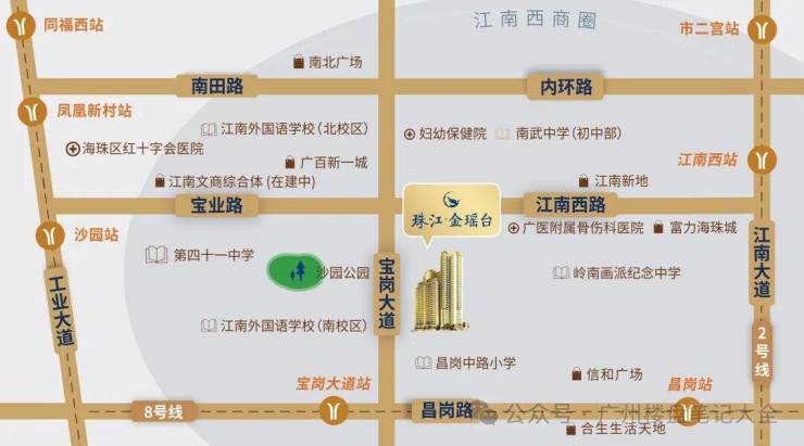 项目对面即为广州市江南外国语学校(省一级),周边2公里内昌岗中路小学、广州市第五中学、广州市南武中学等多所省级名校环伺;