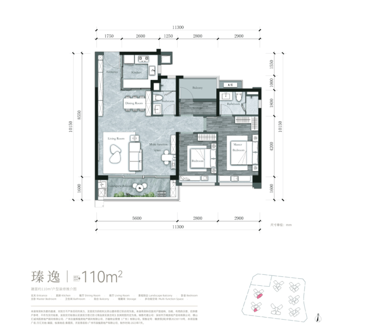 建面约 110m² 户型可改四房,全开间朝南,约 11.3 米南向采光面,百变灵动空间,LDK 客餐厨一体化。