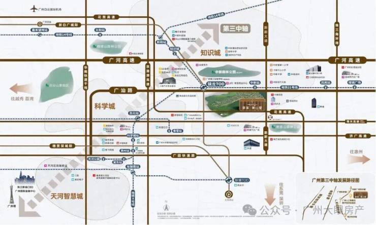 项目距地铁21号线中新站仅约500米,通过家门口的21号线,便可实现1站镇龙TOD、4站天河。而镇龙TOD,又可进一步握手“3地铁+1城轨+5高速”的超级路网,通过14号线可快速畅连黄埔、白云核芯区;