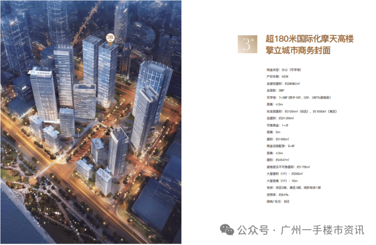 目前项目在售的3号楼写字楼产品总高38层,写字楼整层面积约1054-1060㎡,可整层出售或者半层500㎡出售,写字楼仅有少量楼层可以选择,已经全部都是毛坯现楼交付状态。
