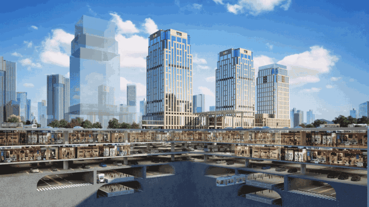 且地下的5层空间,汇聚地铁、轻轨、公交、汽车、APM等立体交通方式,打破平面式交通格局,实现地面零车流,为城市空间扩容。