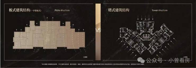 ×塔楼:混合朝向,并非户户朝南,户型间存在遮挡,容易产生对视,室内空气流线差,换气效果相对较差。