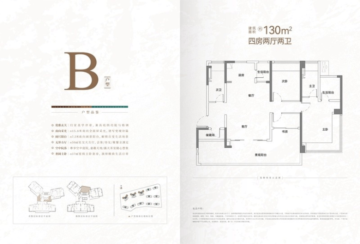 130㎡四房两厅两卫户型采用南北对流设计,专梯专户保障私密性,客厅与阳台相连,采光通风效果好