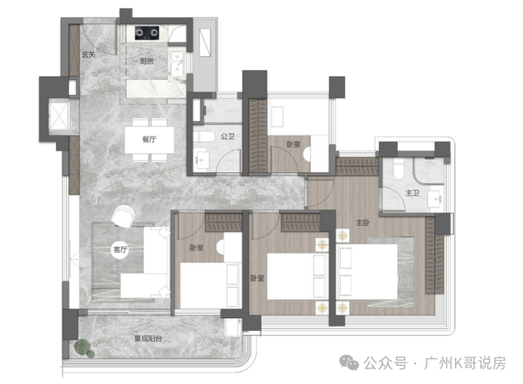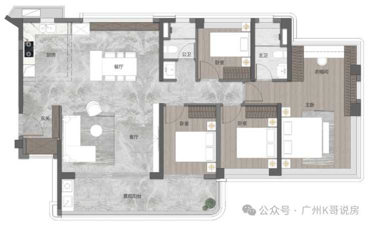 先来看95㎡的户型,南向三房设计,客餐厅和阳台开间去到5.6米,也可改四房,主卧套房设计,带270°大飘窗。