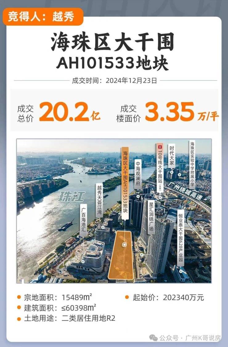 海珠大干围AH101533地块,2024年12月23号越秀地产竞得,建面6万方+,总价超20亿,折合楼面价33501元/平。