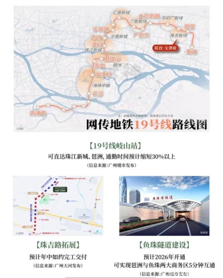 项目离最近的地铁7号线姬堂站约3公里,基本告别地铁通勤,出门主要开车为主,网传规划一条19号线地铁,但是何时落地是未知数,鱼珠隧道2026年开通,去海珠更加方便。