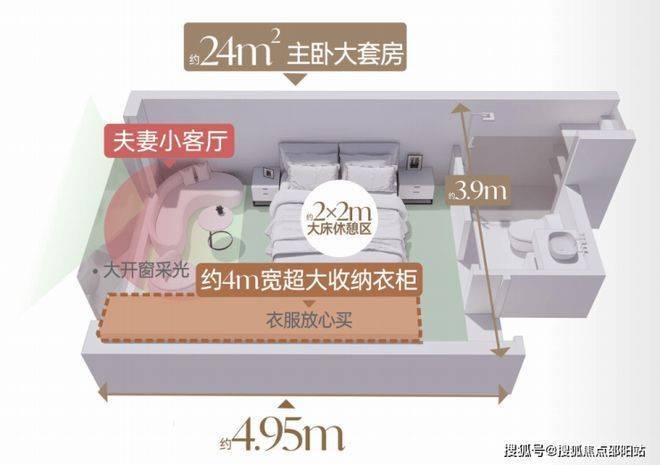 约22㎡主卧大套房,约3.8m南向面宽,全景飘窗,营造出开阔的空间感,晨曦午后,悦心私享天地。