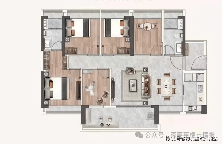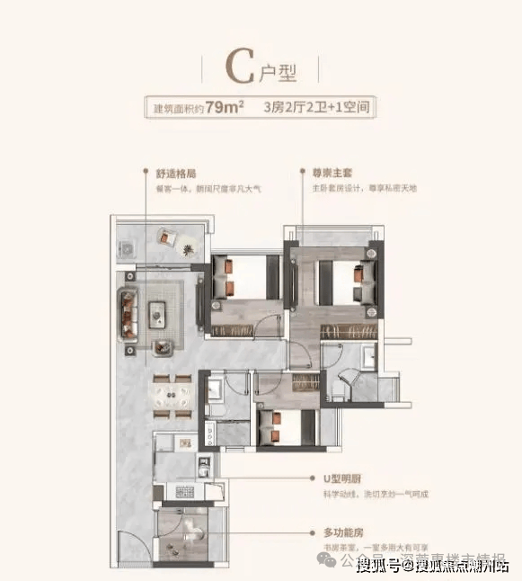建面79平四房两卫,主卧套房设计,U型厨房,餐客一体化设计,书房茶室一室多用。