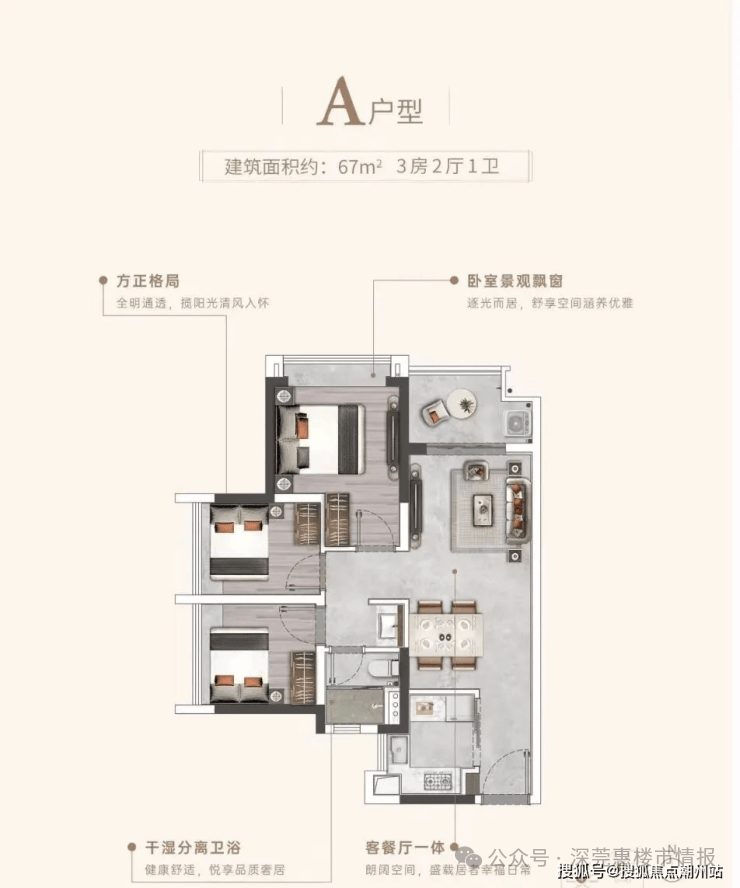 建面67平三房,厨房U型设计,3个卧室都有大飘窗,客餐厅一体化设计。