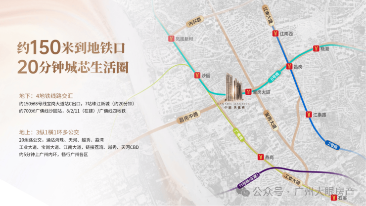项目距离8号线宝岗大道地铁C出口仅200米,步行几分钟即达,是个妥妥的地铁盘,乘坐8号线,无论是去往老荔湾还算琶洲都非常方便,项目距离广佛线沙园站也才800米,步行大概14分钟左右,算的上是个双地铁楼盘
