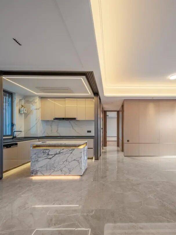 驾车入库,车马厅地面是细腻的环氧磨石拼花,墙面是温润的宝格丽紫奢石,每道接缝都精准对位,铺陈出典雅大气的底色。感应灯光随着车行渐次点亮,如无声的礼宾,静静照亮归家的最后一段路程。