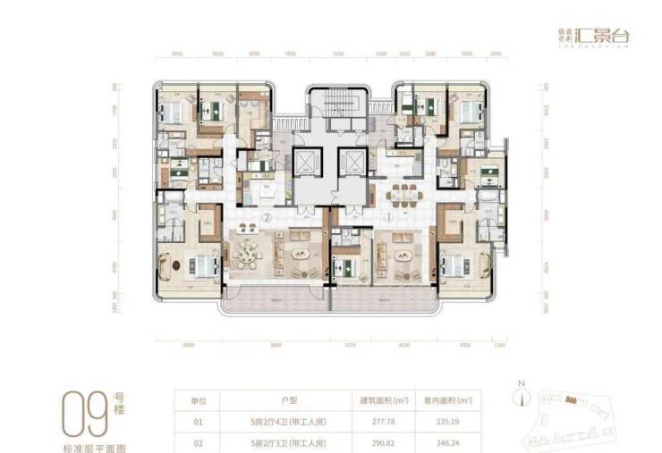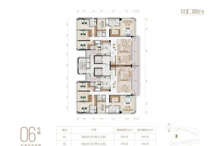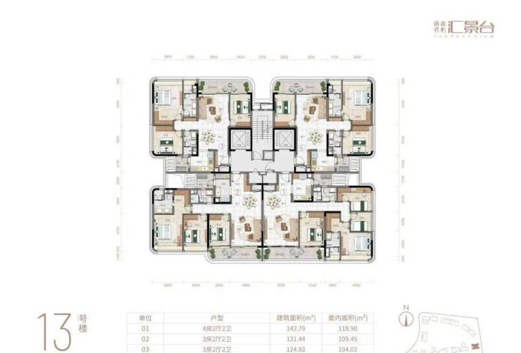 项目由14栋12层小高层组成,产品涵盖123-352㎡三至五房,共8类户型,户型实用率约82-84%