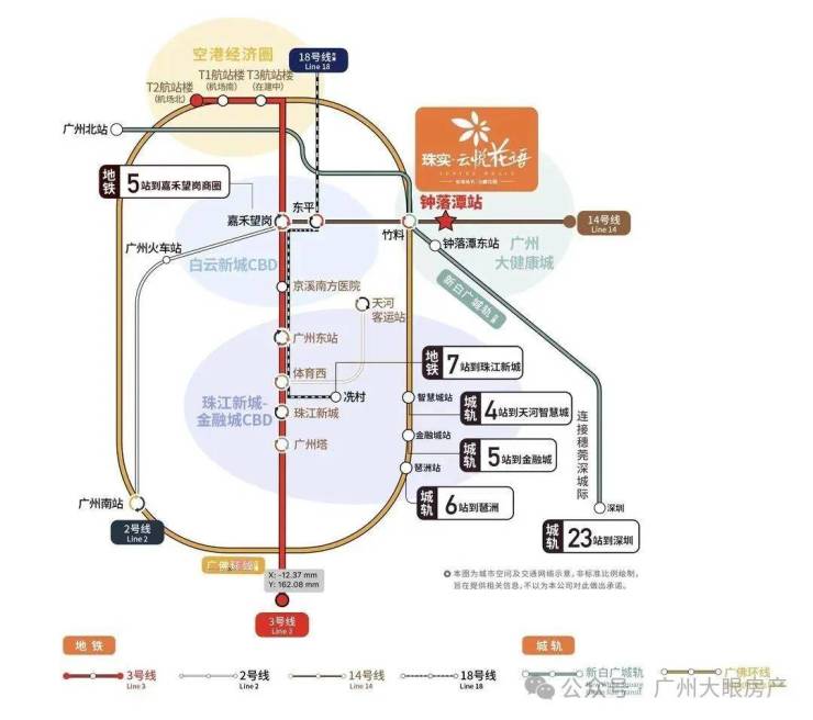 项目位于地铁14号线钟落潭站旁,距离大概1000米,5站到嘉禾望岗,换乘2、3号线可直通白云新城和畅达广州全城;