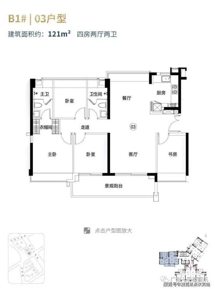 而约124㎡四房则是121㎡的PLUS版本,整体格局大差不大,不过就是在餐厅北侧多了一个生活阳台,而景观阳台也连接到了书房位置