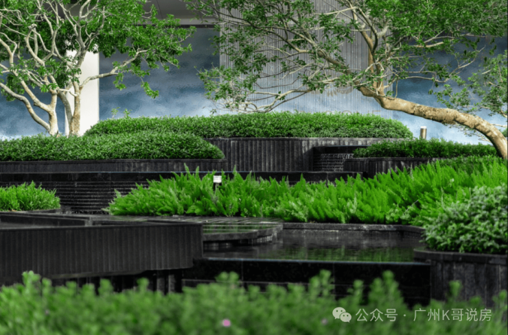 水流从入口叠水瀑布倾泻而下,奔向中央镜面水池,再沿着步道溪流蜿蜒流至全园各处,业主们沿着步道漫步,能依次体验 “听水的舒缓、观水的灵动、亲水的惬意”,这是传统平面园林没有的感受。