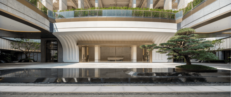 在下沉式庭院中央,一棵约5米高的迎客松巍然矗立,搭配普拉达绿的奢石背景墙,成为引人注目的景观焦点。它不仅是一道独特的风景线,更是岭南建筑特色“四水归堂”理念的重要体现。与无边界的流水相映成趣,营造出松韵、水波、月影交融的意境。罗汉雕塑、水景与玻璃幕墙巧妙融合,在阳光洒落的天井中,与自然展开一场静谧的对话。