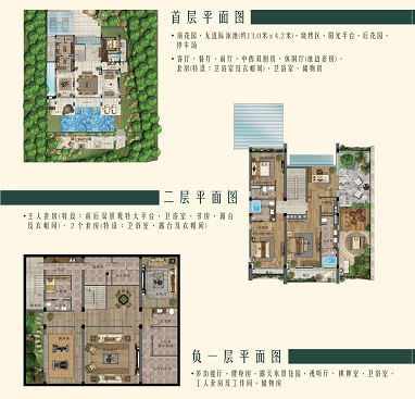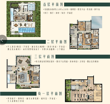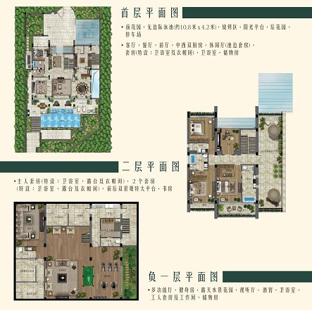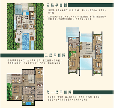 4室4厅6卫;地上二层,地下一层;单层净挑高4m;超大阳光平台;前入户停车花园,双车位;私家泳池花园层层叠加设计,配48㎡独立泳池,活动平台;烧烤区;前后花园设有独立入户门,业主可自由出入;步行2分钟即可到达沙滩海边。