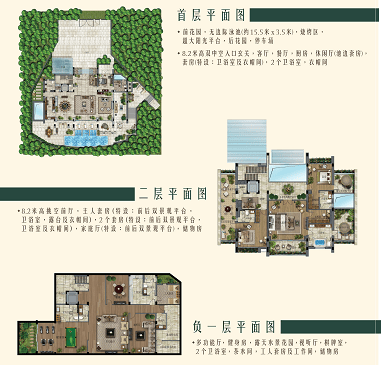 5室4厅7卫;地上二层,地下一层;单层净挑高4m;超大阳光平台;超大前入户停车花园,双车位;私家泳池花园层层叠加设计,配58㎡独立泳池,活动平台;烧烤区;前后花园设有独立入户门,业主可自由出入;步行2分钟即可到达沙滩海边。