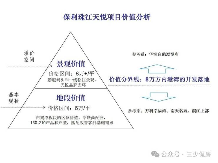 这个项目的溢价空间来源于江景,如果内港湾能如愿最终建成,加上保利天悦的品牌加持,可以支撑8万以上的价格。广州的江景到处都有,只有稀缺的江景才是购买的理由,珠江天悦可以比肩华润白鹅潭悦府。