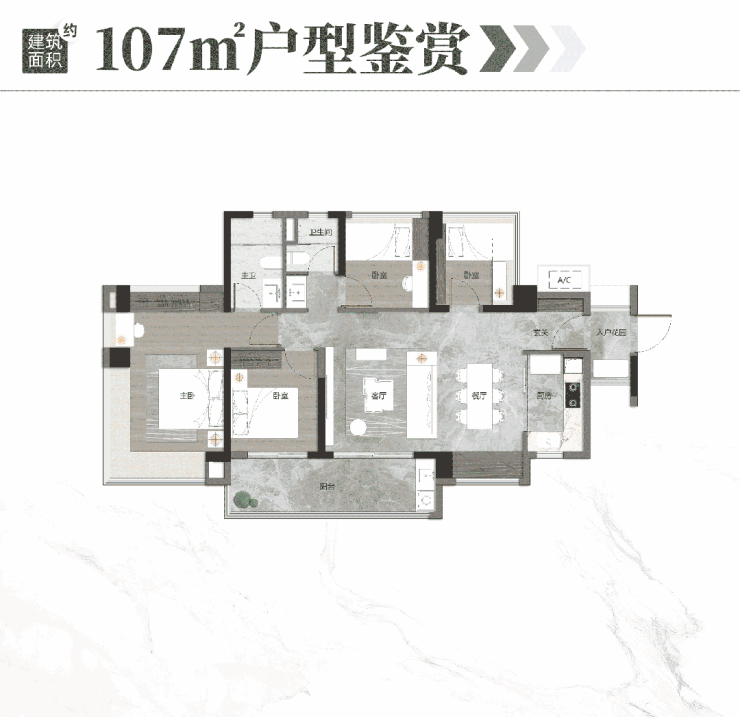 入户玄关,LDKB一体化设计,套房式主卧设计,刚需相当友好。
