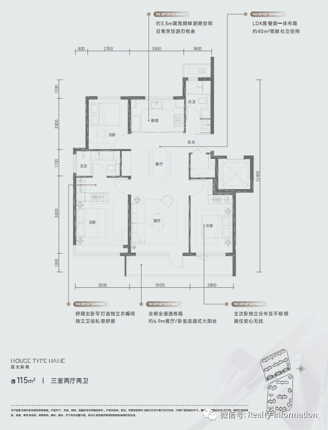 115平米三居室:舒适三居,南北通透。会所式的家庭聚会:LDKG客餐厅一体化设计,满足多功能 聚会场景,豪标U型大厨房,洗切炒操作从容流畅。约6.7米宽境阳台,温暖生活 不请自来。步入式玄关,超强整理全时光收纳,运动的热爱、萌宝婴儿车,更大空 间实现整洁的生活。“主卧小家化”理念,主卧配置转角飘窗,独立步入式衣帽间 。公卫干湿分离,使用高效。得房率约85%,预算1000万内,这个户型是主力其中一款,房源可选的多一些。