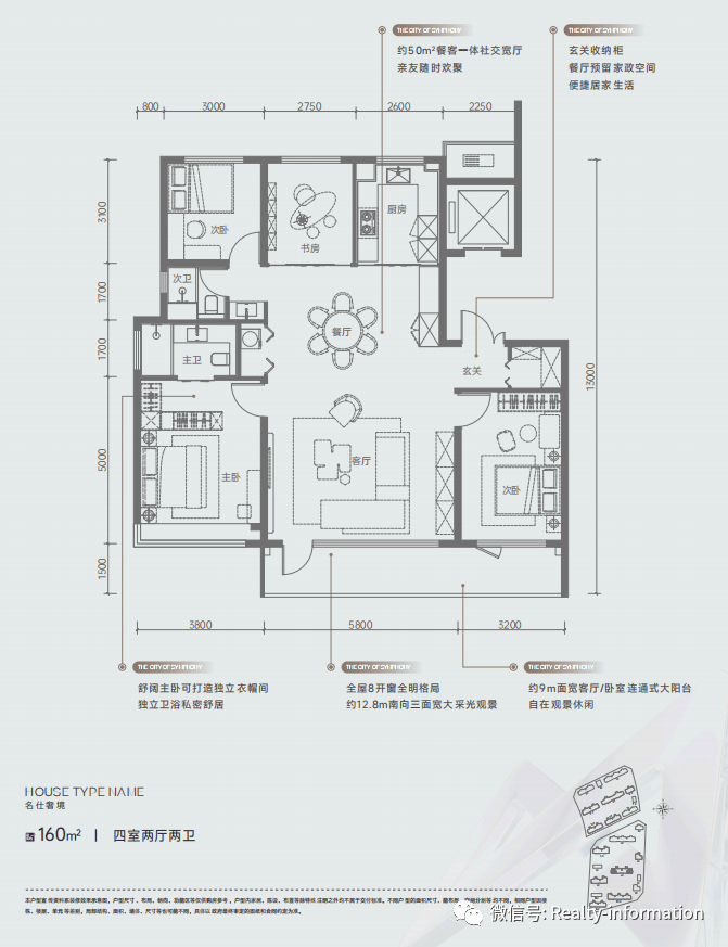 160㎡四居室:四叶草户型,北区楼王位置,直瞰园区核心景观。无界全景视线:3.15m至臻层高,南 向12.8m超大面宽,南北通透。私享尊贵入户:赠送独立电梯厅,向外延伸家的空 间,入户尽享私密礼序;户内玄关超强收纳空间,藏风聚气更添生活私密,让归家 第一步更显仪式。会所式的家庭聚会:LDKG一体化方厅设计,近50m²社交空间, 生活不设限,畅享居家派对。约9米IMAX宽境阳台,绿轴风光纵览无余。“主卧 小家化”理念,主卧配置转角飘窗,独立步入式衣帽间。公卫干湿分离,设立独立 家政间,生活从容有序。