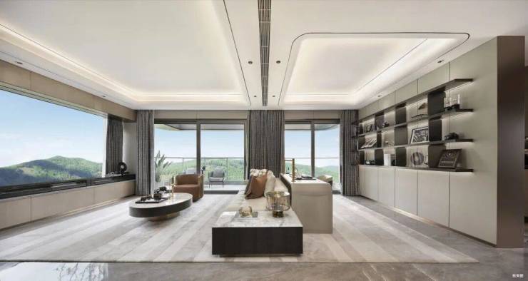例如约280㎡户型打造面积超50㎡的双空中观景庭院与超80㎡横厅相连,在室内就能无界看景,站在露台上就仿佛置身于山林之间,伸手就仿佛能触摸到山景,很是震撼;摆上望远镜,还能随时欣赏星空。