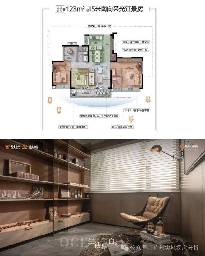 建面约123㎡王牌户型:4.5开间朝南+15米采光面,主次卧双南向。