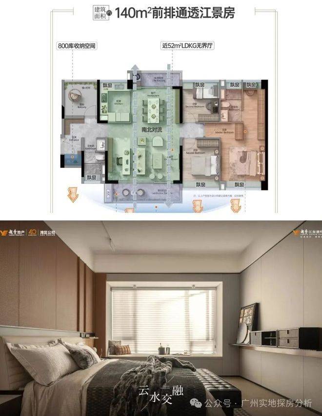 建面约140㎡奢阔四房:双阳台+16米南向面宽,衣帽间+套房主卧。