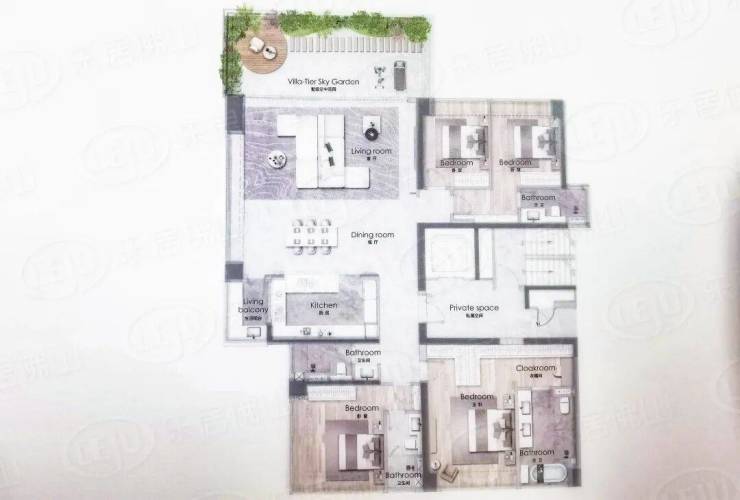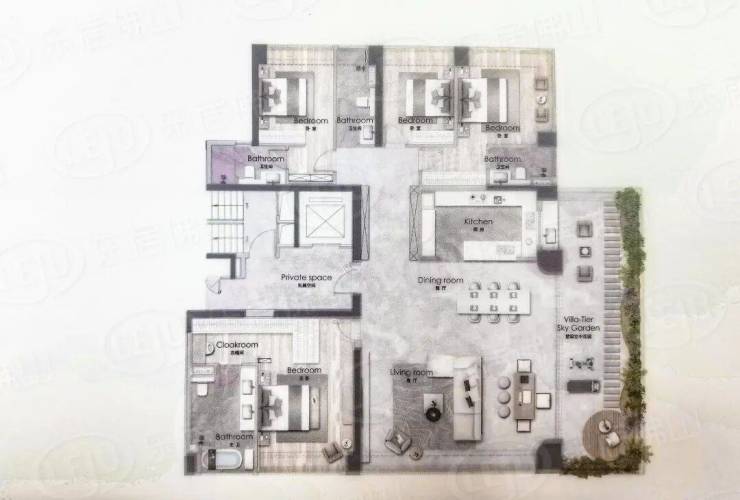 而建面约268㎡的户型则是四房两厅四卫设计,带有三套间。