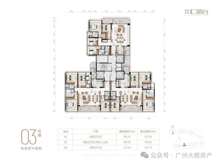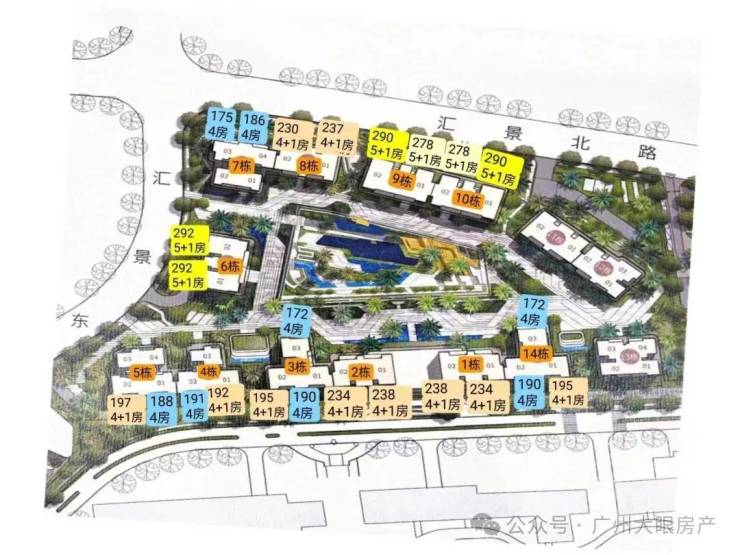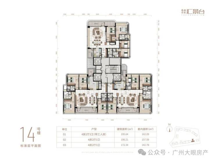 项目由14栋12层小高层组成,产品涵盖123-352㎡三至五房,共8类户型,户型实用率约82-84%