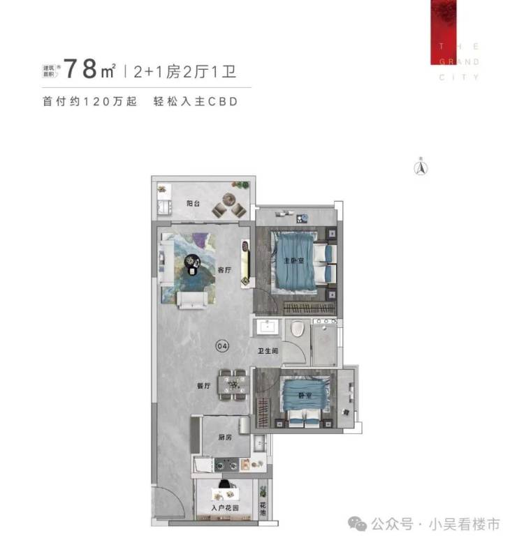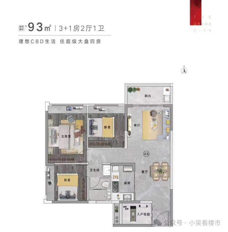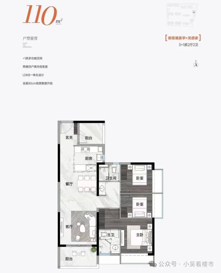 建面110平3+1房,LDKB一体化设计,厅出阳台,南向三面采光,入户处的灵动空间可改成钢琴房、老人房或者电竞房!