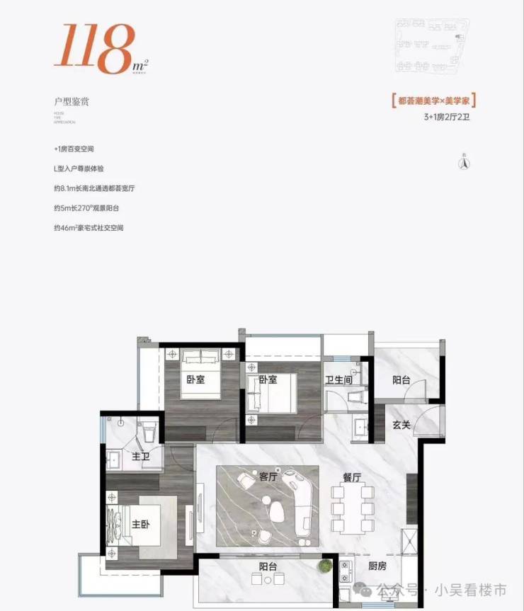 建面118平3+1房,L型的入户动线,横厅设计,面积达到46平,约8.1米长,南向5米阳台,分离式公卫,单价4.6万起!