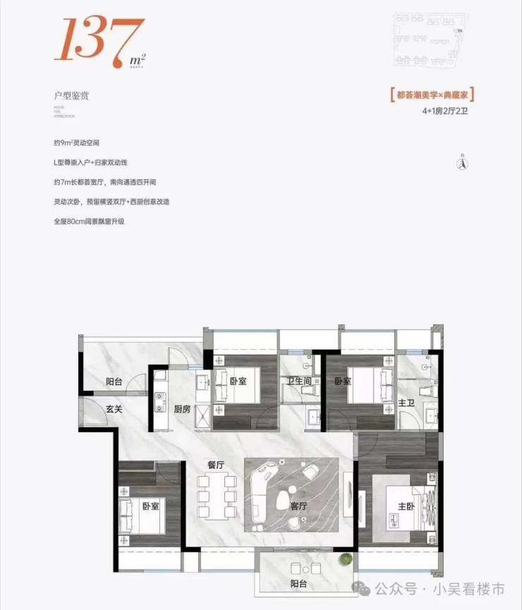 建面137平4+1房,这个户型最大亮点就是多一房,还预留了横竖双厅、西厨创意改造空间,南向通透四开间,L型入户,灵动空间约9平,可改造多个房间,单价4.7万起!