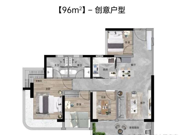 【96㎡四房两厅两卫】:西南向,使用率100%,约5.7米面宽瞰山阳台,主卧270°主卧弧形玻璃幕窗。