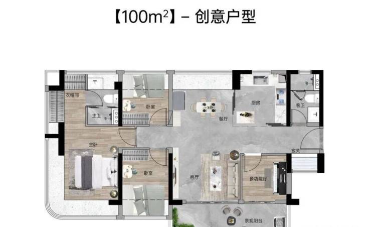 【100㎡四房两厅两卫】:西南向,使用率109%,南北通透,约6.1米巨幕阳台,主卧270°主卧弧形玻璃幕窗。