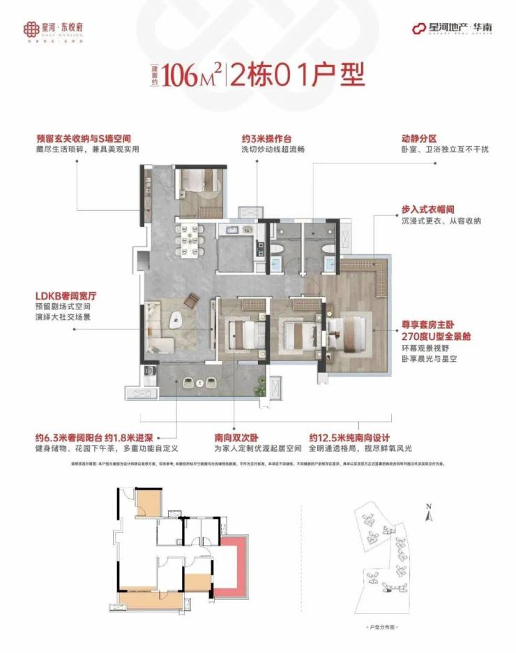 106㎡户型,6.3米大阳台+四开间南向四房