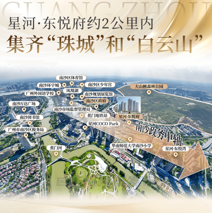 南沙区政府、三馆一宫、南沙中心医院、南沙外国语学、蕉门地铁站等,半数以上的高端市政和配套资源都汇聚于此。