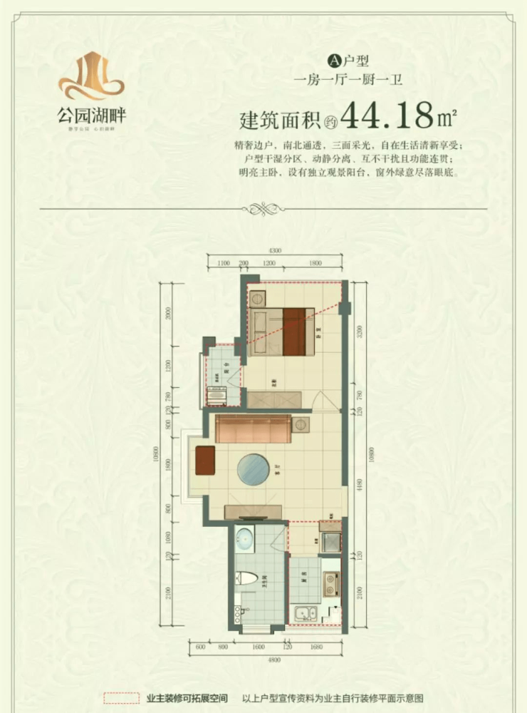 A户型 建筑面积44.18㎡ 一室一厅一厨一卫