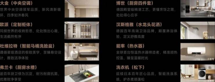 大金(中央空调)、欧派(定制柜体)、杜维拉特(智能马桶洗脸盆) 、弗兰卡(厨房水槽)、博世(厨房四件套)、 汉斯格雅(水龙头花洒)、 洗衣机(松下)
