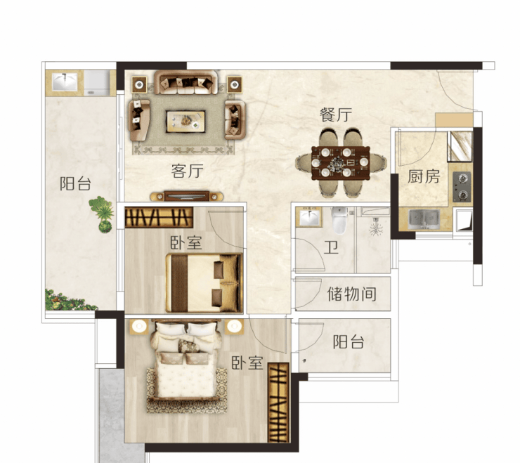 B户型 建面约85m² 2房2厅1卫 ◆户型方正实用,动静分区,布局合理