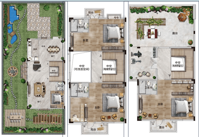 四联二层半,建筑基底卙地约100㎡,6.8米开间客厅面积:62㎡,三主套设计带约67-125㎡超大花园露台+中空赠送面积约50㎡