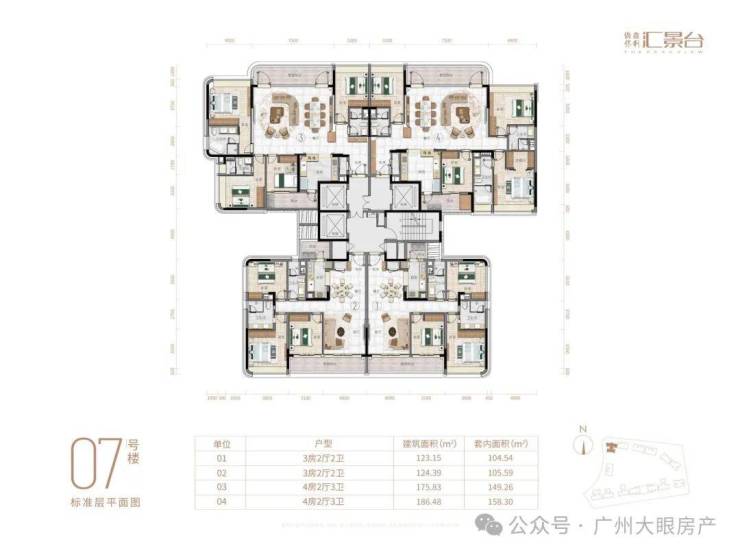 项目由14栋12层小高层组成,产品涵盖123-352㎡三至五房,共8类户型,户型实用率约82-84%