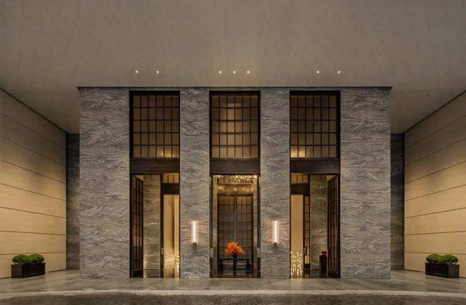 这是超10m挑高的酒店式归家大堂,水云纱石材和深色木饰面的沉稳,瞬间让心安静了下来。
