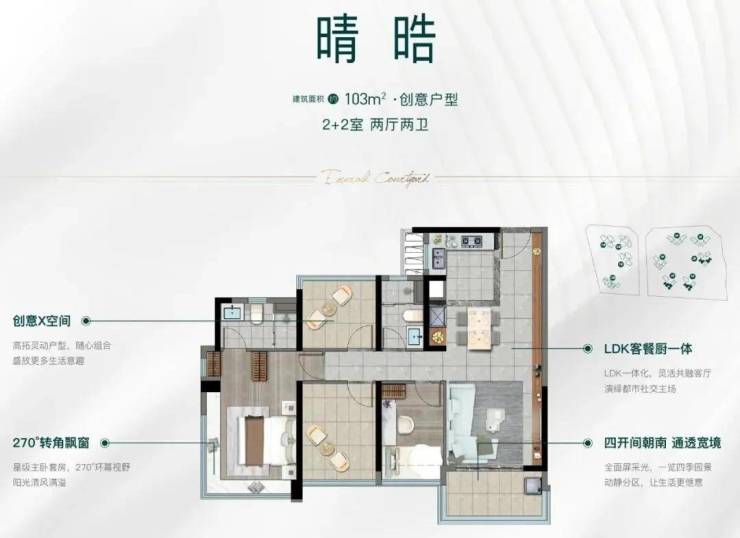 有可以组合使用功能的X空间;4开间朝南,动区和静区完全分开;LDK客餐厨一体化带来更大的空间感和通透感.