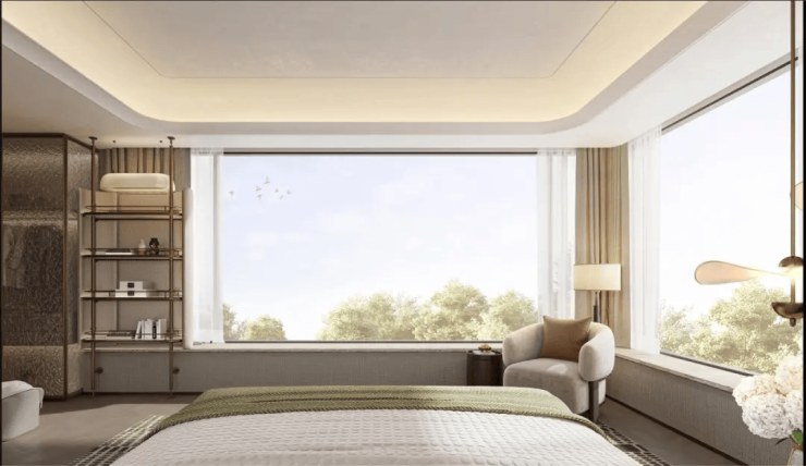 部分户型采用无柱飘窗设计,配合大面积玻璃幕墙,提供开阔的景观视野。