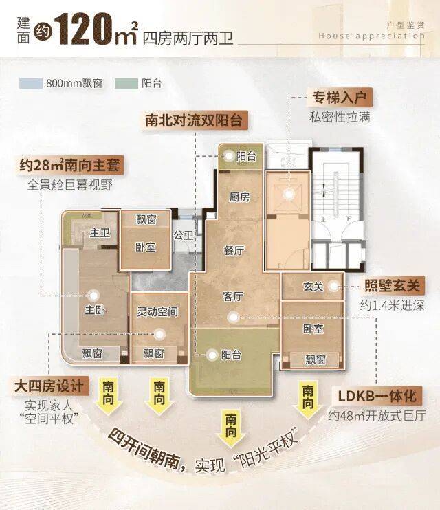 户型设置南北双阳台,包括观景阳台和多功能生活阳台。