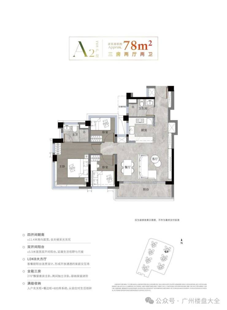78㎡:3房2厅2卫,建面使用率高达 115%-121%(套内使用率 144-152%);使用面积约 965㎡,超越一路之隔的城市之光 99 ㎡三房(使用面积约 79 ㎡),秒杀市面上绝大多数 90 ㎡以内产品。