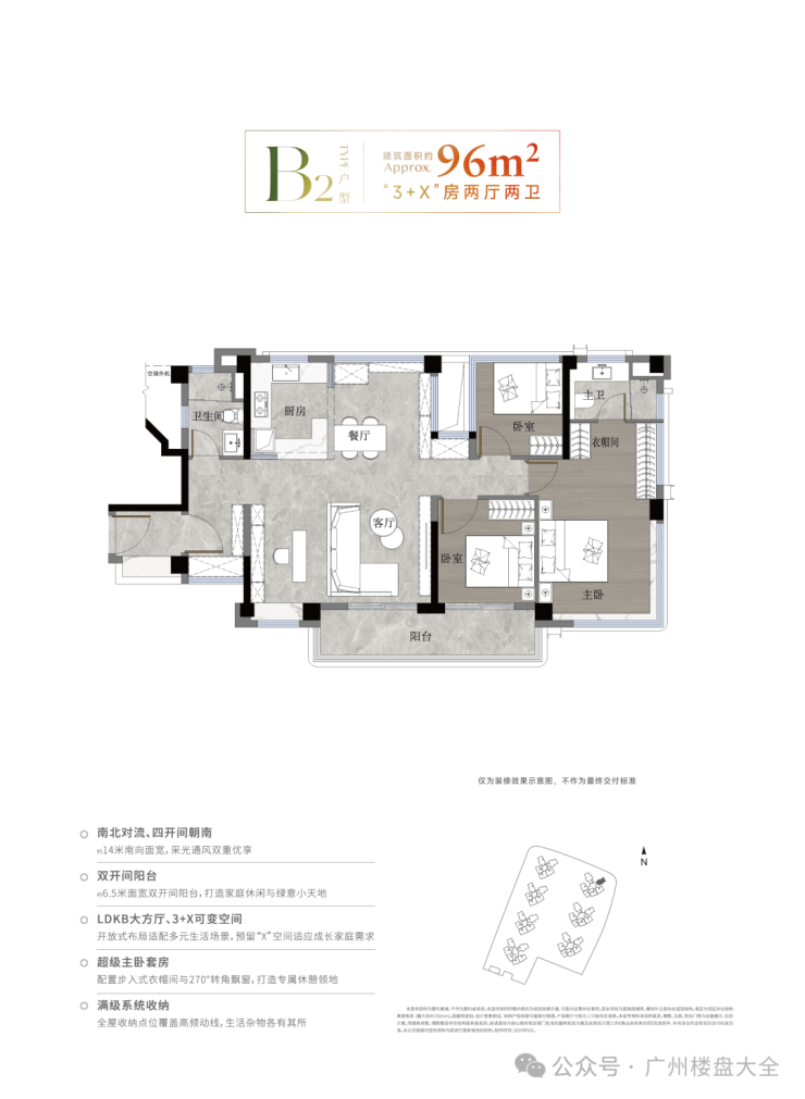 96㎡:3+1房2厅2卫,建面使用率高达 110-118%(套内使用率 138-148%),使用面积约 111-115㎡,与一路之隔的城市之光143㎡四房相当(使用面积约114m),与市面 110-120 ㎡三四房产品使用面积相当。
